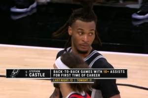目前,二年级新秀卡斯尔已经得到12分2篮板11助攻2抢断;据统计,卡斯尔连续两场比赛助攻上双,个人职业生涯首次。