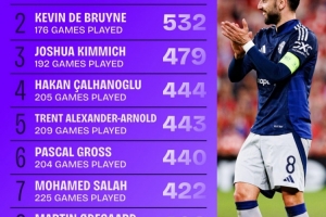 2、德布劳内:176场创造532次机会