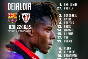 在续约前后,毕尔巴鄂都曾公开批评巴萨,两家俱乐部关系紧张。如今看来,他们似乎并未忘记过去,毕尔巴鄂的社媒选择使用尼科照片来公布他们前往诺坎普球场的比赛阵容。
