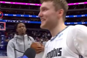 赛后,灰熊球员卡姆·斯潘塞接受采访,莫兰特插入对话,说道:“告诉他们今晚最好的射手是谁,不是来自金州的那个家伙。(指克莱)”