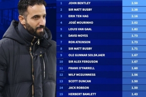 体育资讯11月25日讯 《转会市场》统计了阿莫林执教第一年在老特拉福德的场均拿分情况,1.43分仅能位列队史第16位。