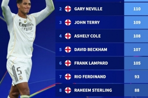 体育资讯11月5日讯 在本轮欧冠,利物浦1-0击败皇马。贝林厄姆完成生涯50场欧冠里程碑,德转也盘点了英格兰球员欧冠出场次数榜,具体如下: