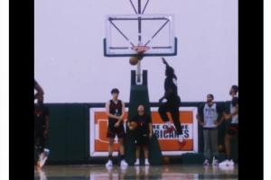 视频中的杨瀚森与翻译在篮下看队友扣篮热身。