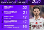 根据Squawka的统计,赖斯是2025年各项赛事中创造绝佳机会最多的英超球员(23次)。